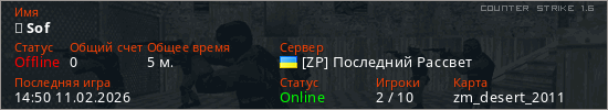 Играет на Counter Strike 1.6 сервере. Страна: УкраинаПервый раз замечен 14:46 11.02.2026