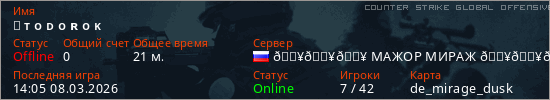 Играет на Counter Strike Global Offensive сервере. Страна: РоссияПервый раз замечен 12:31 30.07.2025