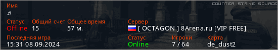 Играет на Counter Strike Source сервере. Страна: РоссияПервый раз замечен 05:28 15.03.2020