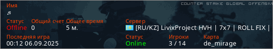 Играет на Counter Strike Global Offensive сервере. Страна: КазахстанПервый раз замечен 23:32 05.09.2025