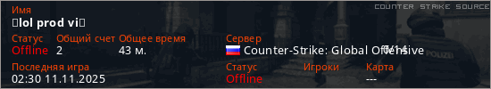 Играет на Counter Strike Source сервере. Страна: РоссияПервый раз замечен 22:19 07.11.2025