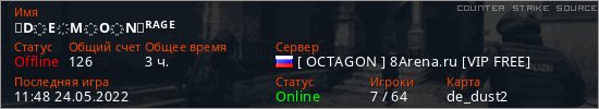 Играет на Counter Strike Source сервере. Страна: РоссияПервый раз замечен 09:47 04.05.2022