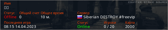 Играет на Counter Strike Source сервере. Страна: РоссияПервый раз замечен 08:07 14.04.2023