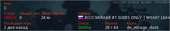 Играет на Counter Strike Global Offensive сервере. Страна: РоссияПервый раз замечен 14:45 08.07.2025