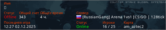 Играет на Counter Strike Global Offensive сервере. Страна: РоссияПервый раз замечен 22:17 11.07.2025