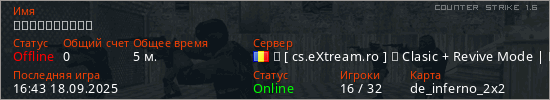 Играет на Counter Strike 1.6 сервере. Страна: РумынияПервый раз замечен 16:41 18.09.2025