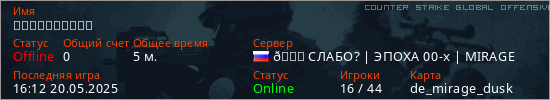 Играет на Counter Strike Global Offensive сервере. Страна: РоссияПервый раз замечен 15:30 20.05.2025