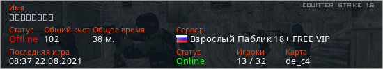 Играет на Counter Strike 1.6 сервере. Страна: РоссияПервый раз замечен 08:01 22.08.2021
