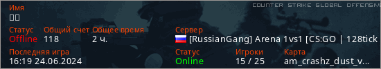 Играет на Counter Strike Global Offensive сервере. Страна: РоссияПервый раз замечен 16:21 23.02.2024
