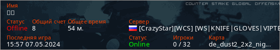 Играет на Counter Strike Global Offensive сервере. Страна: РоссияПервый раз замечен 10:27 23.02.2024