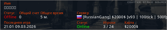 Играет на Counter Strike Source сервере. Страна: РоссияПервый раз замечен 20:52 09.03.2026