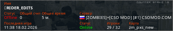 Играет на Counter Strike 1.6 сервере. Страна: РоссияПервый раз замечен 11:36 18.02.2026