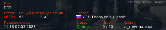 Играет на Counter Strike Source сервере. Страна: РоссияПервый раз замечен 18:02 04.03.2023