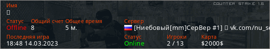Последний раз был в сети 18:48 14.03.2023 Игрок с таким ником замечен на 7 серверах