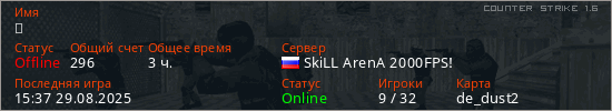Последний раз был в сети 15:37 29.08.2025 Игрок с таким ником замечен на 15 серверах