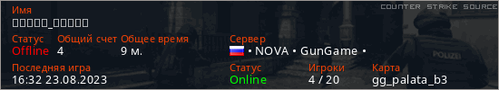 Играет на Counter Strike Source сервере. Страна: РоссияПервый раз замечен 12:20 23.08.2023