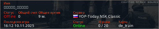 Играет на Counter Strike Source сервере. Страна: РоссияПервый раз замечен 14:05 09.11.2025