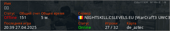 Играет на Counter Strike 1.6 сервере. Страна: РумынияПервый раз замечен 20:36 27.04.2025