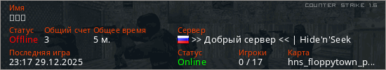 Играет на Counter Strike 1.6 сервере. Страна: РоссияПервый раз замечен 22:40 29.12.2025