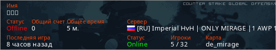 Играет на Counter Strike Global Offensive сервере. Страна: РоссияПервый раз замечен 17:14 23.12.2025