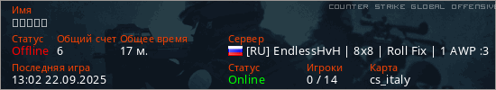 Играет на Counter Strike Global Offensive сервере. Страна: РоссияПервый раз замечен 12:03 07.09.2025