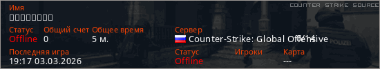 Играет на Counter Strike Source сервере. Страна: РоссияПервый раз замечен 18:58 03.03.2026