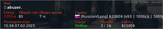 Играет на Counter Strike Source сервере. Страна: РоссияПервый раз замечен 17:34 29.01.2024