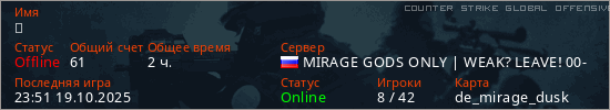 Играет на Counter Strike Global Offensive сервере. Страна: РоссияПервый раз замечен 15:15 08.03.2025