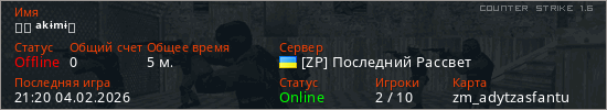 Играет на Counter Strike 1.6 сервере. Страна: УкраинаПервый раз замечен 20:53 04.02.2026