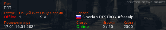 Играет на Counter Strike Source сервере. Страна: РоссияПервый раз замечен 16:34 16.01.2024