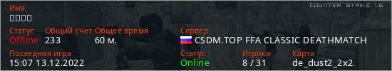 Играет на Counter Strike 1.6 сервере. Страна: РоссияПервый раз замечен 03:47 12.12.2022