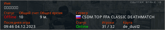 Играет на Counter Strike 1.6 сервере. Страна: РоссияПервый раз замечен 10:18 03.12.2023
