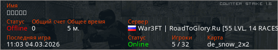 Играет на Counter Strike 1.6 сервере. Страна: РоссияПервый раз замечен 10:53 04.03.2026