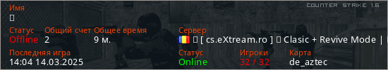 Играет на Counter Strike 1.6 сервере. Страна: РумынияПервый раз замечен 13:43 24.12.2024