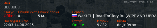 Играет на Counter Strike 1.6 сервере. Страна: РоссияПервый раз замечен 21:44 14.08.2025