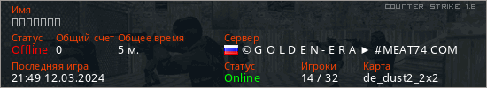 Играет на Counter Strike 1.6 сервере. Страна: РоссияПервый раз замечен 21:47 12.03.2024