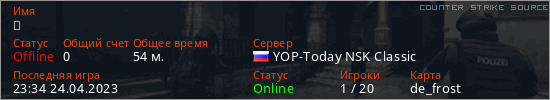 Играет на Counter Strike Source сервере. Страна: РоссияПервый раз замечен 00:44 19.04.2023