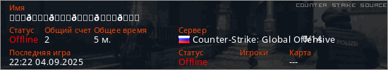 Играет на Counter Strike Source сервере. Страна: РоссияПервый раз замечен 22:02 04.09.2025
