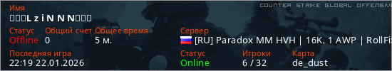 Играет на Counter Strike Global Offensive сервере. Страна: РоссияПервый раз замечен 21:56 22.01.2026
