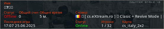 Играет на Counter Strike 1.6 сервере. Страна: РумынияПервый раз замечен 17:05 25.06.2025