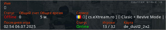 Играет на Counter Strike 1.6 сервере. Страна: РумынияПервый раз замечен 02:52 06.07.2025