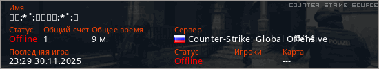 Играет на Counter Strike Source сервере. Страна: РоссияПервый раз замечен 01:42 11.11.2025