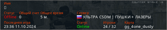 Играет на Counter Strike 1.6 сервере. Страна: РоссияПервый раз замечен 23:20 11.10.2024