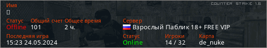 Последний раз был в сети 15:23 24.05.2024 Игрок с таким ником замечен на 14 серверах