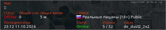 Играет на Counter Strike 1.6 сервере. Страна: РоссияПервый раз замечен 22:56 11.10.2024