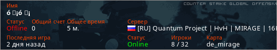 Играет на Counter Strike Global Offensive сервере. Страна: РоссияПервый раз замечен 20:40 08.04.2026