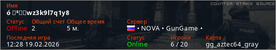 Играет на Counter Strike Source сервере. Страна: РоссияПервый раз замечен 12:19 19.02.2026