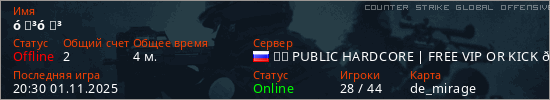 Играет на Counter Strike Global Offensive сервере. Страна: РоссияПервый раз замечен 20:28 01.11.2025