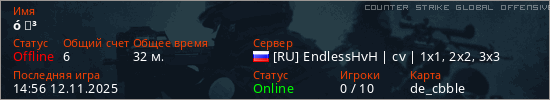 Играет на Counter Strike Global Offensive сервере. Страна: РоссияПервый раз замечен 10:50 11.11.2025