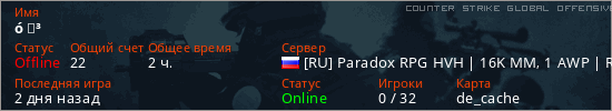 Играет на Counter Strike Global Offensive сервере. Страна: РоссияПервый раз замечен 19:44 06.05.2025